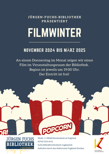 Von November bis März wird an einem Donnerstag im Monat jeweils um 19:00 Uhr ein Film für Erwachsene im Veranstaltungsraum der Bibliothek gezeigt. Der Eintritt ist frei, für Kinosnacks und Getränke...