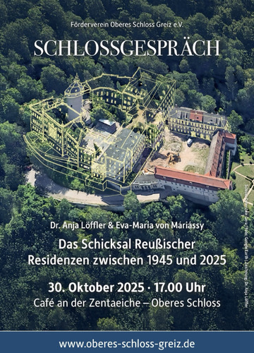 Die nächste Veranstaltung des Fördervereins im Rahmen der Reihe „Schlossgespräche“ findet am 30. Oktober 2025 statt. Im „Café an der Zentaeiche“, Oberes Schloss Greiz, referieren Frau Dr. Anja Löffler und Frau Eva-Maria von Máriássy zum Thema „Das Schicksal Reußischer Residenzen zwischen 1945 und 2025“. Der Beginn der Veranstaltung ist 17 Uhr. Platzreservierungen sind möglich. (03661 69836 oder 0170 3506332)