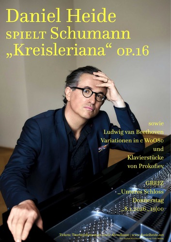 Zum Beginn des Konzertjahres 2026 kann man im Festsaal des Unteren Schlosses Robert Schumanns „Kreisleriana“ op.16 hören. Zu diesen 8 Fantasien für Klavier wurde Schumann von E.T.A.Hoffmanns Erzählungen über den mysteriösen Kapellmeister Kreisler inspiriert. Beethovens 32 Variationen WoO80 ergänzen das Programm genauso wie Klavierstücke aus Prokofievs „Romeo & Julia“ sowie „Cinderella“.