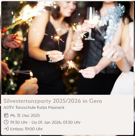 Feiern Sie unter dem Motto "ZEITREISE" den Jahreswechsel mit Stil und Schwung in unserer Tanzschule!Kleiden Sie sich im Stil ihrer Lieblingszeit/Lieblingsjahrzehnt und tanzen Sie gemeinsam mit uns und guter Gesellschaft in eine unvergessliche Silvesternacht voller Freude und Unterhaltung.Sichern Sie sich noch heute Ihre Tickets für diese Silvesternacht in unserer Tanzschule. Begrenzte Plätze verfügbar! Nutzen Sie die Gelegenheit, das alte Jahr mit einem Lächeln zu verabschieden und das neue Jahr mit freudigen (Tanz)Momenten zu begrüßen.Tanzen. Lachen. Feiern. Willkommen im neuen Jahr in unserer Tanzschule!
