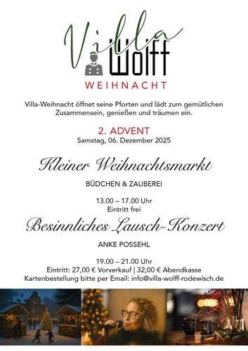 Willkommen zur ersten Villa Weihnacht in Rodewisch! Als stimmungsvlollen Abschluss unserer Villa-Weihnacht erwartet euch das Lauschkonzert mit Anke Possehl - ein musikalisches Highlight zum Ausklang des Abends! Wir freuen uns auf euch - herzlich willkommen zur ersten Villa Weihnacht in Rodewisch! Sichert Euch jetzt Eure Plätze -Kartenvorbestellung für das Lauschkonzert ab sofort möglich: info@villa-wolff-rodewisch.de