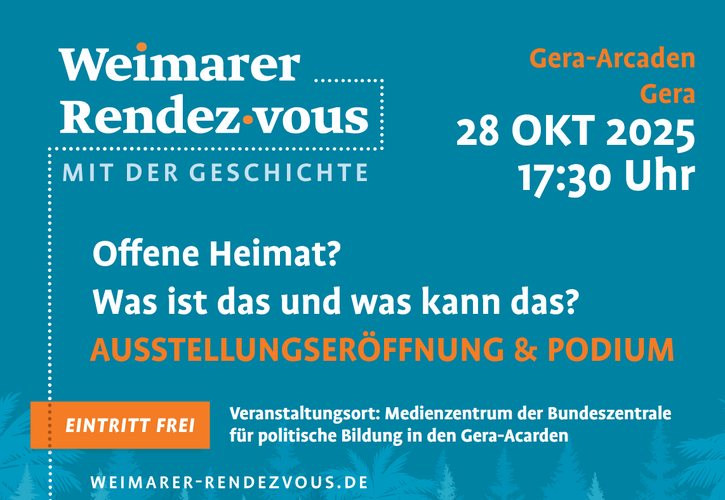 Kultur und Landschaft, Brauch und Tracht, Musik und Theater, Handwerk und Industrie – Thüringen hat seit Jahrhunderten von kulturellen Einflüssen und Zugewanderten aus aller Herren Länder profitiert. Diese vielfältigen Einflüsse, genauso wie die Dinge, die Thüringer in die Welt trugen, zeigt die Ausstellung »Thüringen – Land der offenen Heimaten« des Thüringer Heimatbundes. Wir eröffnen die Ausstellung am 28.10. in den Gera Arcaden, wo sie bis zum 5.11. den Shopping-Gästen neue Perspektiven auf ihre Heimat aufzeigt. Zur Begrüßung führt N.N. durch die Ausstellung.Passend dazu werden wir der Idee einer »offenen Heimat« in einem gemeinsamen Gespräch genauer nachgehen. Wie bekommt man die Pflege von Tradition, ja auch Stolz auf die Heimat mit der Offenheit für neue Ideen, Einflüsse und Menschen unter einen Hut? Kann »Heimat« so gestaltet sein, dass sie ein Ort und Konzept für alle ist, die in einer Region zu Hause sind, unabhängig von Herkunft oder Lebensentwurf? Was ist Ihnen an »Heimat« wichtig? Haben Sie vielleicht auch mehr als eine? Diskutieren Sie mit!Gäste:Führung durch die Ausstellung:Hans-Peter Schmit (Thüringer Heimatbund e.V.)Anschließendes Gespräch:Dr. Annette Schneider-Reinhardt ist wissenschaftliche Referentin für Immaterielles Kulturerbe sowie für Baukultur und Denkmalpflege beim Bund Heimat und Umwelt in Deutschland (BHU), dem Dachverband der Vereine zur Heimatpflege in Deutschland.Ayman Qasarwa ist Vorstandsvorsitzender von Migranetz Thüringen e.V. und Geschäftsführer von DaMOst e.V., dem Dachverband von Migranten und Migrantinnen-Organisationen in Ostdeutschland. Er lebt seit 1990 in Thüringen und pendelt beruflich nach Halle, weil Weimar zu seiner zweiten Heimat geworden ist.Moderation:Dr. Justus H. Ulbricht ist Germanist und Historiker und ist seit Jahrzehnten als Moderator, Referent und Gesprächspartner in der historischen und kulturellen Bildung tätig, vor allem in seinen beiden neuen Heimaten Thüringen und Sachsen.In Kooperation mit dem Heimatbund Thüringen e.V., Migranetz Türingen e.V. und der Bundeszentrale für politische Bildung, Standort Gera.Die Veranstaltung findet im Rahmen des Internationalen Geschichtsfestival Weimarer Rendez-vous mit der Geschichte statt: https://weimarer-rendezvous.de/de/