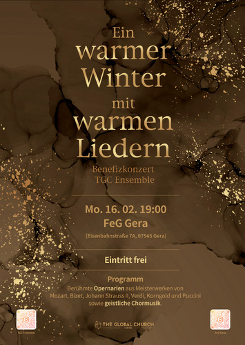Das koreanische Ensemble von Sängerinnen und Sängern aus Seoul und Mailand macht am 16.02. Station in Gera und bringt gute Stimmung in den Gemeindesaal der Freien evangelischen Gemeinde.Im ersten Teil erklingen bekannte klassische Arien, u.a. von Verdi, Donizetti, Mozart und Puccini. Im zweiten Teil singst das Ensemble englische Gospel Hymns, die ins Herz gehen. Ein winterlicher Abend mit warmen Liedern.Der Eintritt ist frei. Um eine Spende wird gebeten. Das TGC-Ensemble unterstützt damit Kinder- und Jugendarbeit in Manila (Philippinen) und eine kirchliche Arbeit in Indien.info@gera.feg.dewww.feggera.de