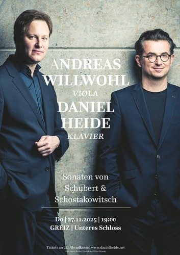Eine selten zu hörende kammermusikalische Kombination ist am 27.11.25 um 19.00 Uhr im Festsaal des Unteren Schlosses zu erleben. Der Erfurter Bratschist Andreas Willwohl gastiert mit Sonaten für sein Instrument, die Bratsche (auch Viola genannt) von Franz Schubert und Dmitri Schostakowitsch.