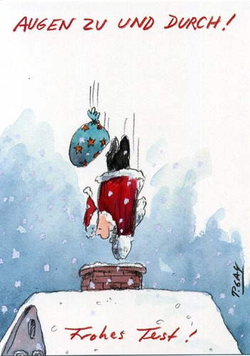 In diesem Jahr wurde Peter Gaymann, der zu den beliebtesten deutschen Cartoonisten zählt, eingeladen. Der Künstler lebt am Starnberger See und feierte in diesem Jahr seinen 75. Geburtstag. Sein Markenzeichen sind eigentlich Cartoons mit Hühnern, für das Weihnachtsthema musste er sich zwangsläufig mit den beiden Hauptprotagonisten beschäftigen – dem Weihnachtsmann und seinem Rentier. Dabei stellt sich heraus, dass der Geschenkebringer auch nicht jünger geworden ist, er so seine Probleme mit dem technischen Fortschritt hat und die Arbeitsbeziehung mit dem Rentier auch weit ins Private reicht und nerven kann.