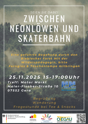 Wir entdecken Bieblach von einer neuen, wilden Seite. Welche Tier- und Pflanzenarten gibt es? Die kostenfreie Veranstaltung findet bei jedem Wetter statt. Bitte Fernglas und Taschenlampe mitbringen.