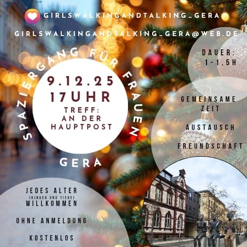 Seit unserem 1. Frauenspaziergang im März 2025 treffen wir uns einmal im Monat zu einem gemütlichen Spaziergang in Gera, diesmal mit weihnachtlichem Flair. Im Anschluss lassen wir den Abend auf dem Markt ausklingen – bei Glühwein, guten Gesprächen und einer Portion Weihnachtszauber.