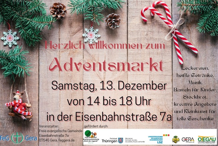 Nach dem gelungenen Auftakt im Vorjahr lädt die Freie evangelische Gemeinde am 13. Dezember zur 2. Auflage ihres Adventsmarktes ein.Hand in Hand mit Netzwerkpartnern wird sich das Gelände in der Eisenbahnstraße 7a in einen bunten Markt verwandeln. In vorweihnachtlicher Atmosphäre gibt es etliche Stände, Leckereien und Roster, Geschichten und Stockbrot am Feuer für Klein und Groß, Bastelangebote, Kunst und Musik, und natürlich wundervolle Begegnungsmöglichkeiten.Der Adventsmarkt wird gefördert durch das Land Thüringen und die Stadt Gera im Rahmen des Landesprogrammes Solidarisches Zusammenleben, durch die Quartiersentwicklung und die OTEGAU.