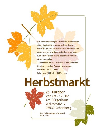 Wir vom Schönberger Carneval Club möchten einen Herbstmarkt veranstalten. Dazu möchten wir SIE recht herzlich einladen. Sie können gerne als Gast vorbeikommen oder