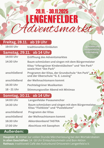 Der Lengenfelder Gewerbeverein, die Stadt Lengenfeld und viele engagierte Vereine freuen sich darauf, Sie auf dem diesjährigen Adventsmarkt willkommen zu heißen.