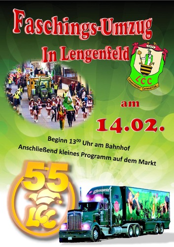Der LCC startet mit seinem Kummitee-Wagen samt Elferrat, Prinzenpaar und Kinderprinzenpaar, gefolgt von der Prinzengarde und den weiteren Garden, seinen Weg durch Lengenfeld. Viele Themenwagen und Laufgruppen unterstützen den Faschingsumzug und geben ein buntes Bild ab.