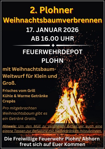 Wir laden euch herzlich ein zum 2. Plohner Weihnachtsbaumverbrennen! Ob jung oder alt – beim Weihnachtsbaumweitwurf ist Spaß garantiert. Wer einen Weihnachtsbaum mitbringt, erhält ein Getränk gratis. Für gemütliche Stimmung und ein wärmendes Feuer ist gesorgt.