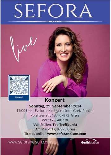 Sefora Nelson stammt aus einer italo-deutschen Großfamilie und musiziert aus Leidenschaft. Das hört und fühlt man. Die international auftretende Künstlerin singt vielsprachig und ist über Deutschland hinaus aus der christlichen Musikszene nicht mehr wegzudenken. Ihr Programm ist mit tiefgründigen, authentischen, witzigen und verzaubernden Geschichten gespickt. Kartenvorverkauf im Treffpunkt Tee, Greiz, Markstr. 17 oder über www.seforanelson.com möglich.