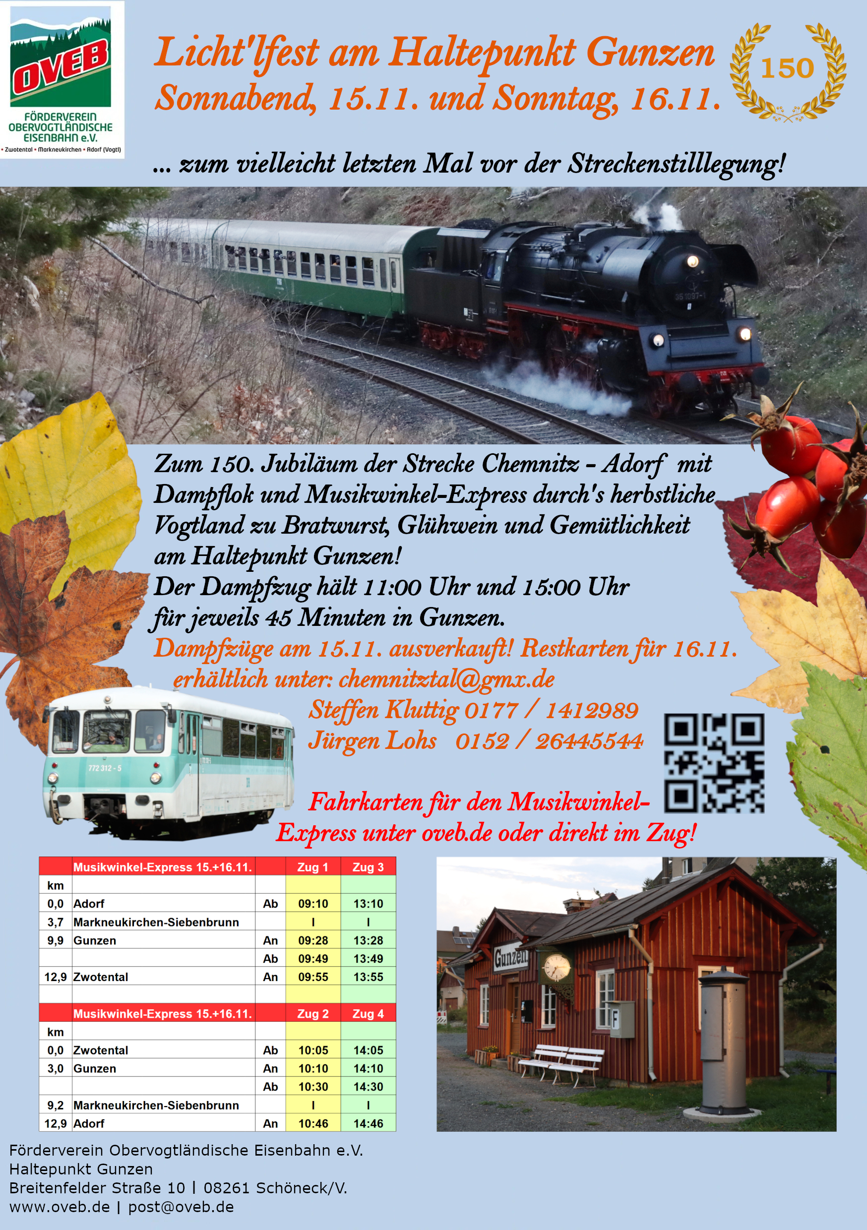 Zum 150. Jubiläum der Strecke Chemnitz - Aue - Adorf am Sonnabend, 15. November 2025 und am Sonntag, 16. November 2025, mit Dampflok und Musikwinkel-Expres durch's herbstliche Vogtland zu Bratwurst, Glühwein und Gemütlichkeit am Haltepunkt Gunzen!