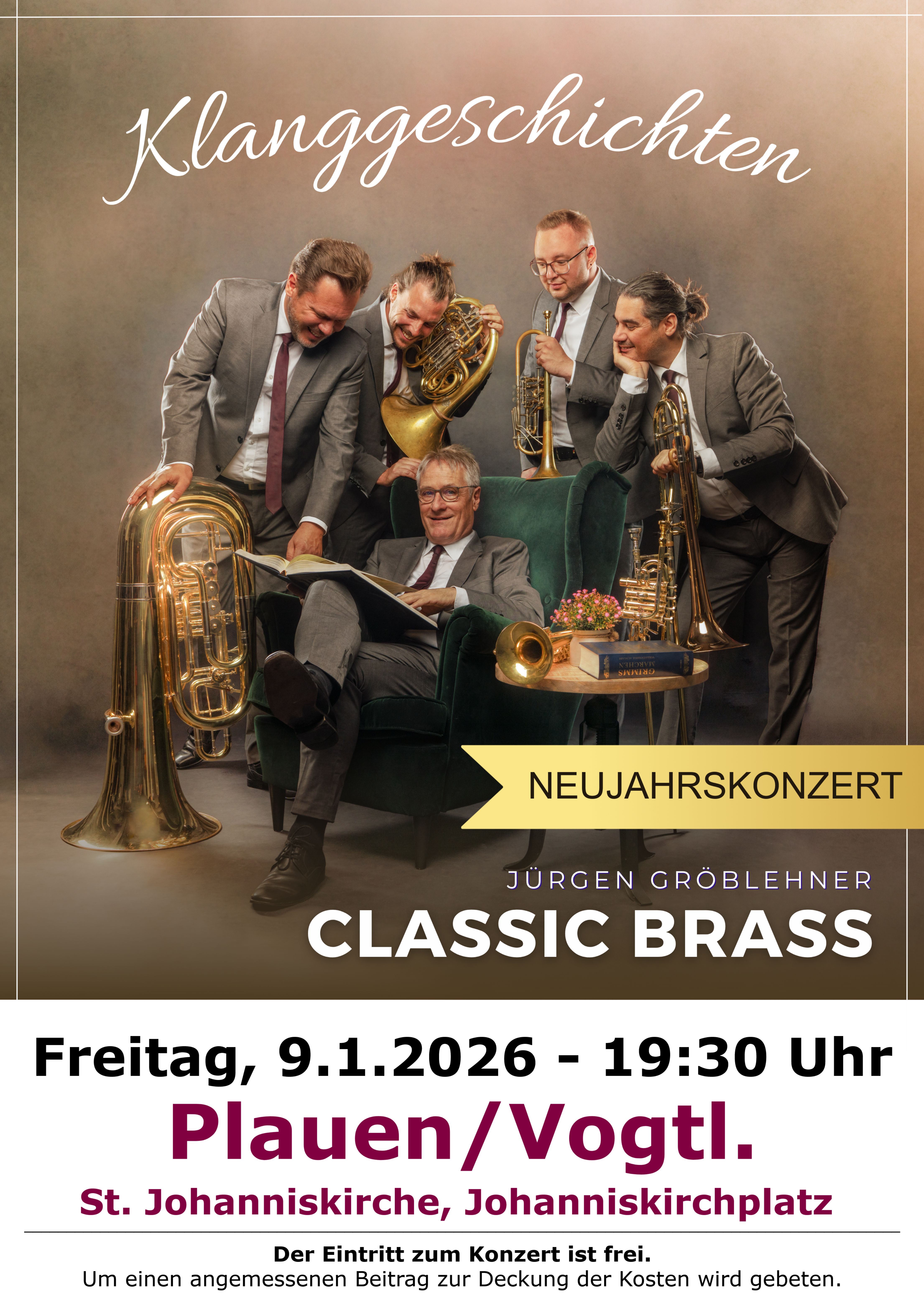 Bereits zum siebenten Mal gastiert CLASSIC BRASS am Freitag, 09.01.2026, 19:30 Uhr mit einem NEUJAHRSKONZERT in der St.-Johannis-Kirche in Plauen/Vogtland. Das Blechbläserensemble gehört zu den renommiertesten Klangkörpern seines Fachs und begeistert weltweit Musikfreunde mit seinem charakteristischen Sound und einem Repertoire von beeindruckender stilistischer Bandbreite.